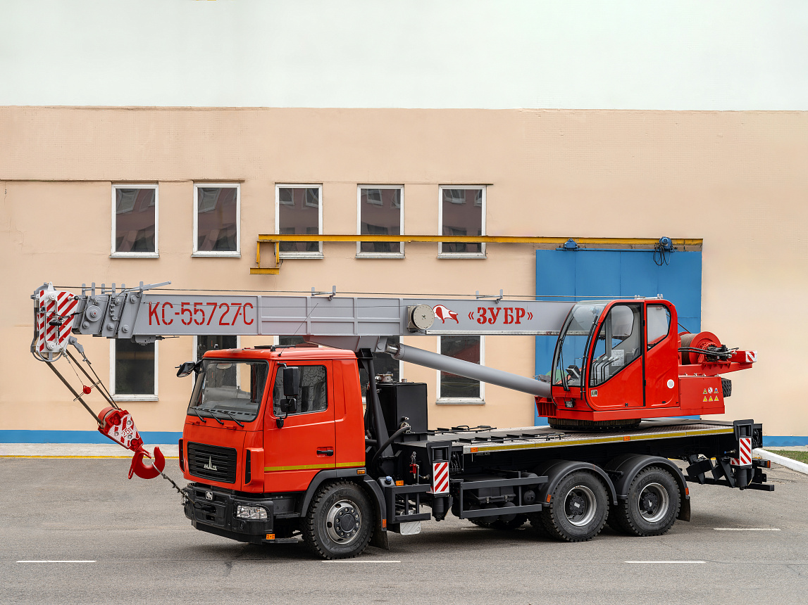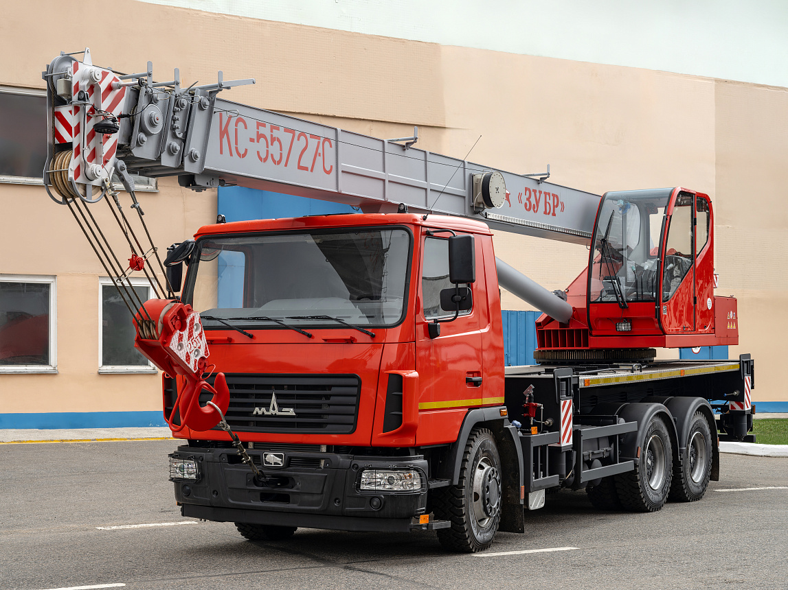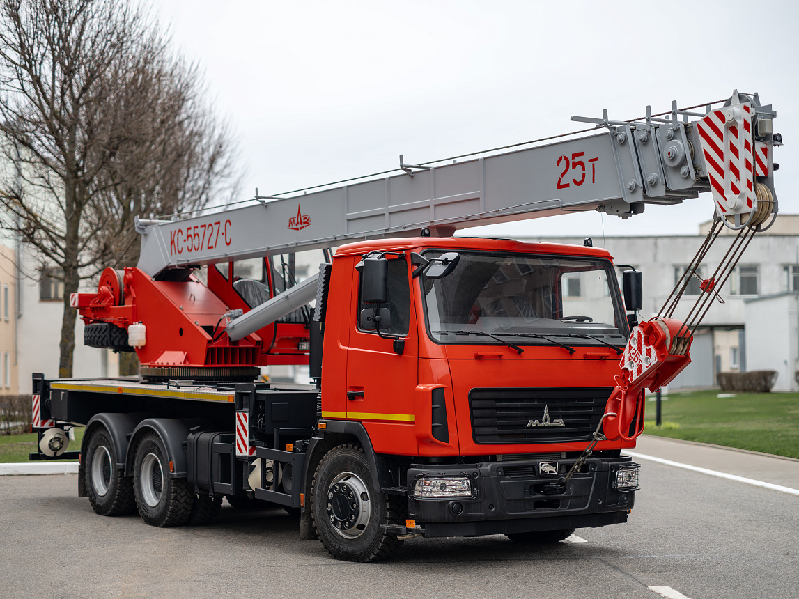 Кран автомобильный КС-55727 грузоподъёмностью миди (на канатах) 25 тонн. Исполнение крана возможно на различных шасси производства Минского автомобильного завода. Кран КС-55727 является классической моделью среднетоннажного крана с прямоугольным профилем стрелы. Важной особенностью модели КС-55727 является развесовка, которая позволяет передвигаться по дорогам общего пользования без "перегруза" по осям.