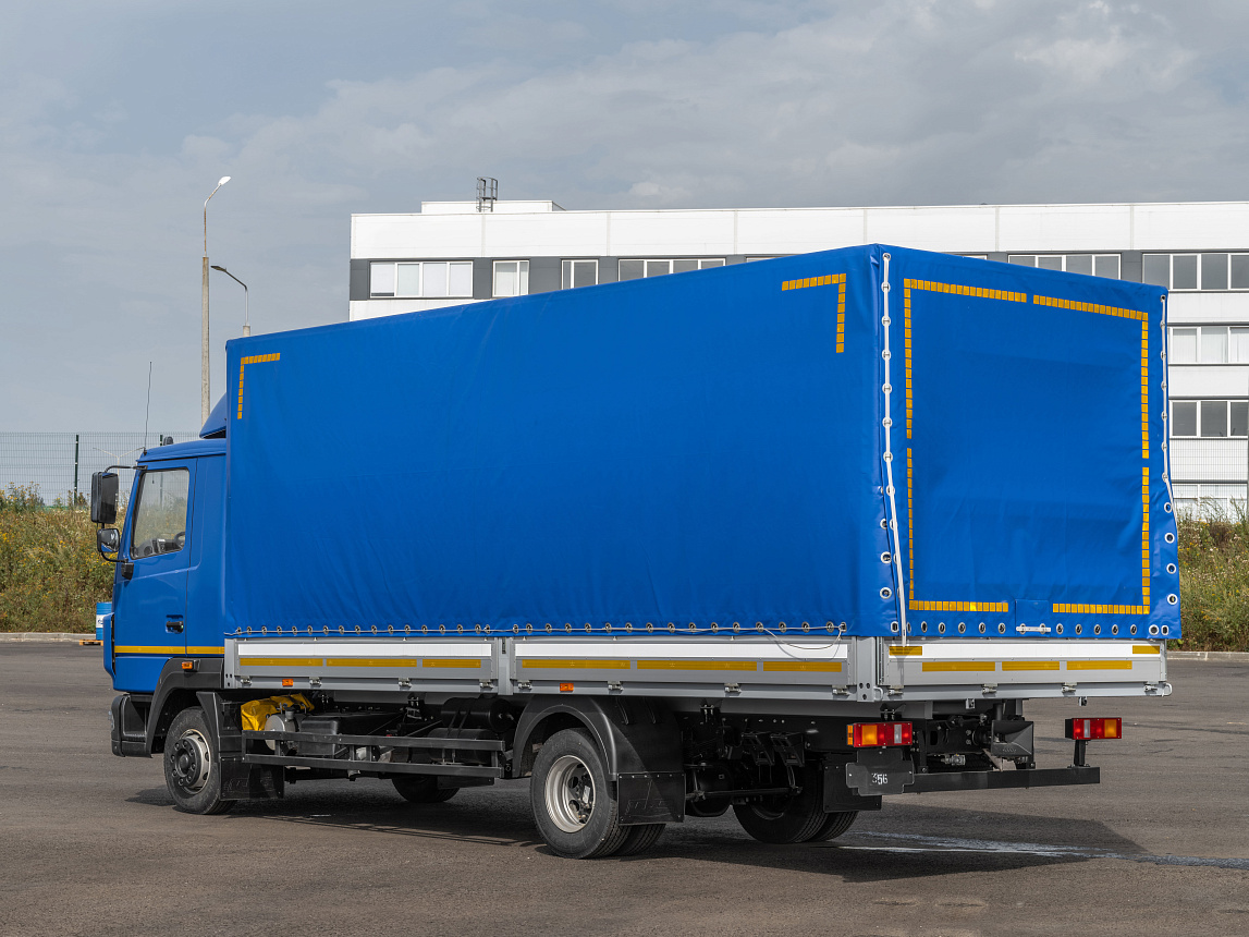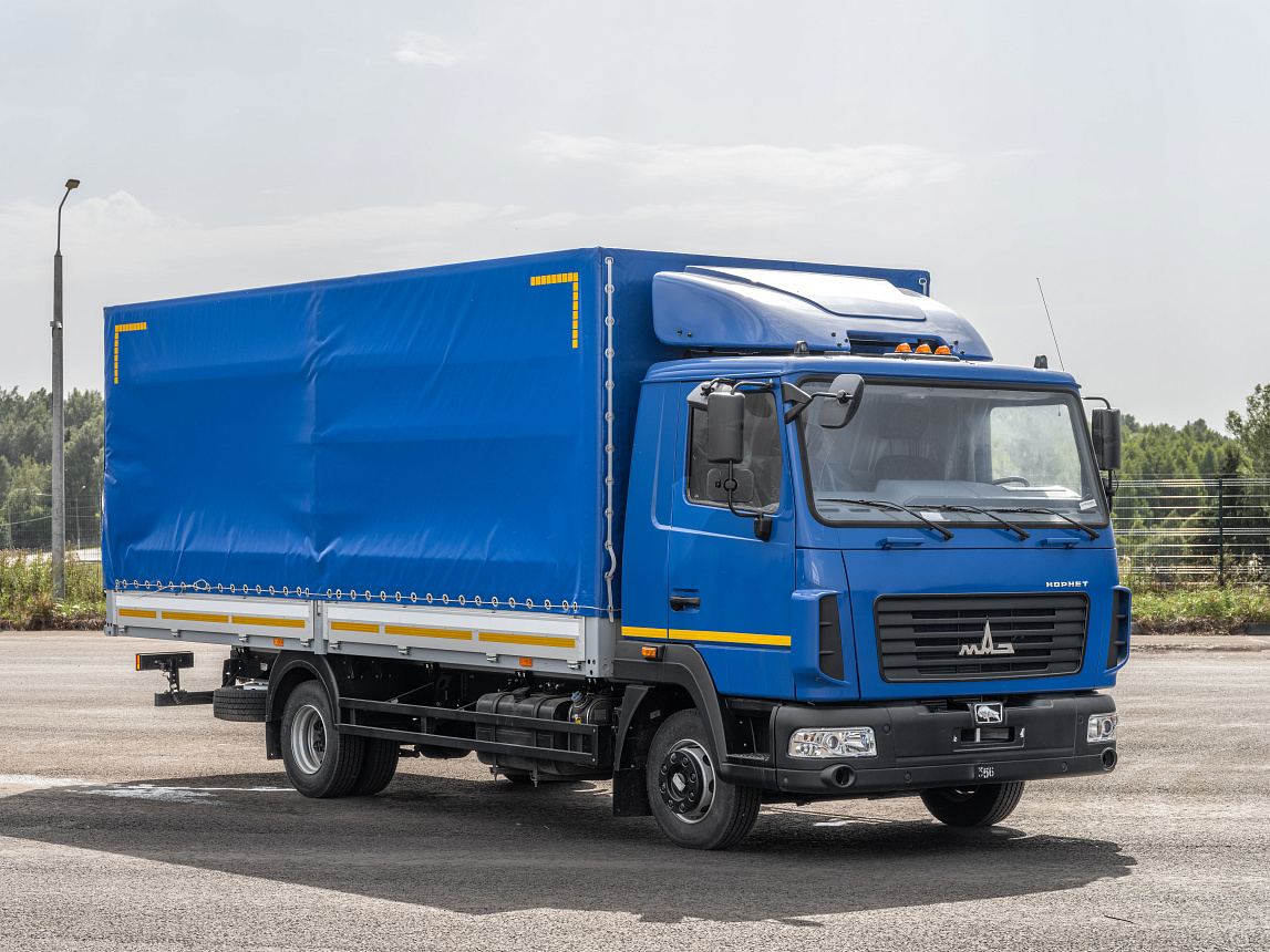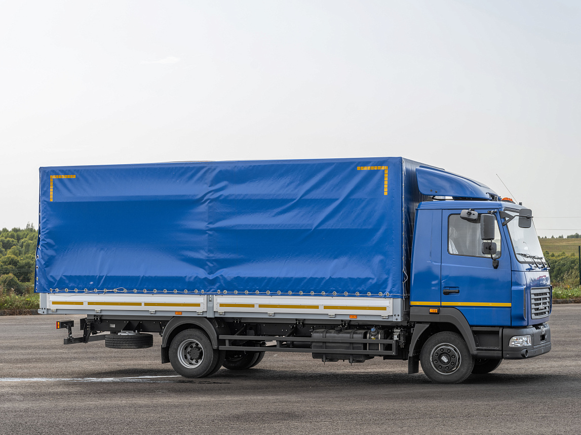 - Грузовой среднетоннажный автомобиль МАЗ-4371, оснащенный малой 3-местной кабиной и тентованной платформой с задним пологом может использоваться для перевозки различных видов грузов.
