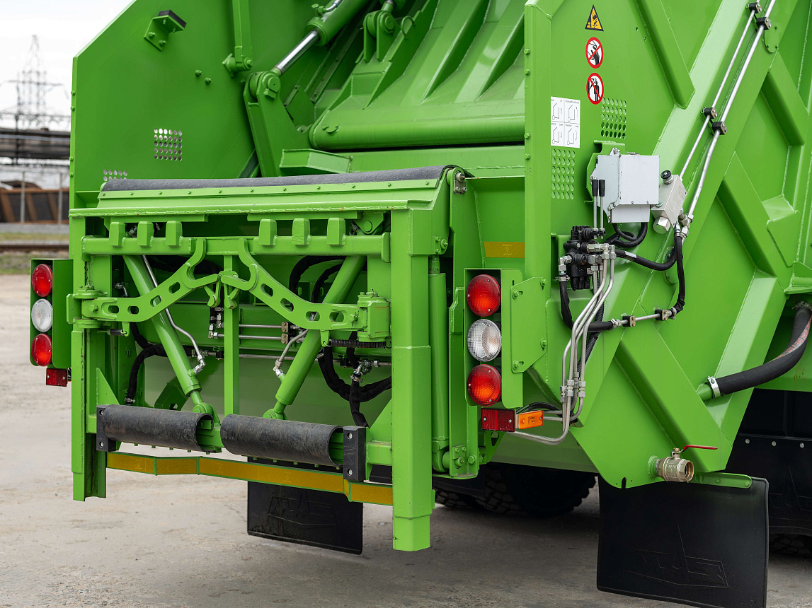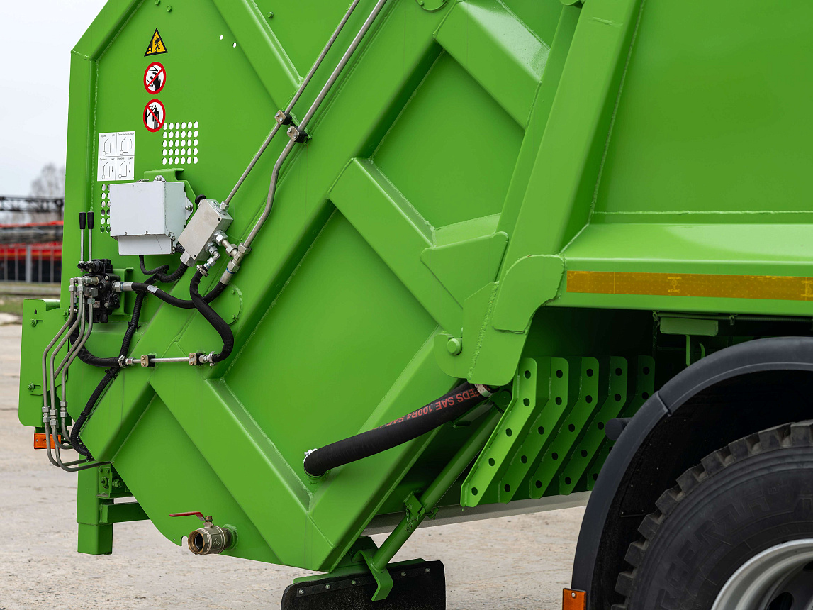Включает все преимущества мусоровоза МАЗ-5904, а таже доработки конструкции подающей плиты и схемы расположения г/ц, что позволило увеличить усилие прессования на 30%.